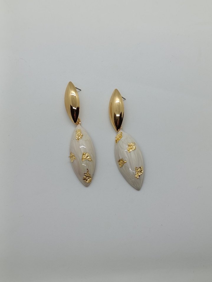 Uzun beyaz küpeler, yılan desenli ve altın boncuk detaylıdır. Minimalist ve çağdaş tarzda, düğün gibi zarif etkinlikler için uygundur.
