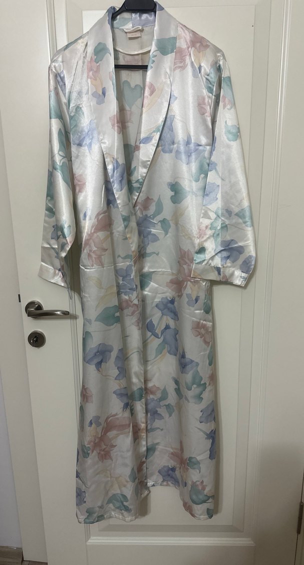 Uzun, bol kesim saten kadın sabahlık, beyaz zemin üzerinde pastel tonlarda batik desenli, uzun kollu ve vintage bohem tarzındadır. Ürün yurtdışından gelmiştir.