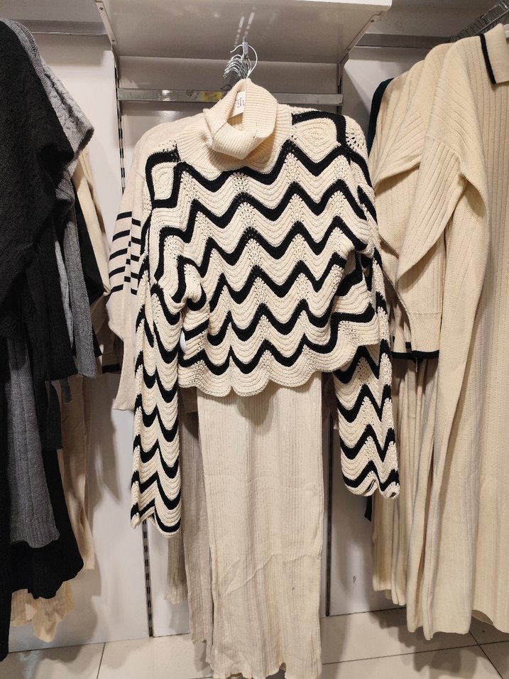 Uzun ve bol kesim örgü kazak, boğazlı yakası ve beyaz-gri zebra desenlidir. Bohem tarzı ve rahat örgü dokusuyla günlük kullanıma uygundur. standart beden