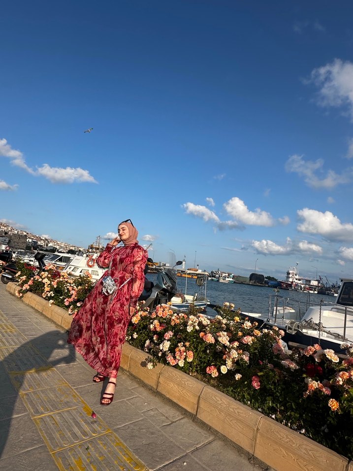 Hafif burgonya tie-dye desenli, ipeksi kumaştan, uzun kollu, halter yakalı ve bol kesim bohem elbise. Günlük kullanıma uygun drapeli model.