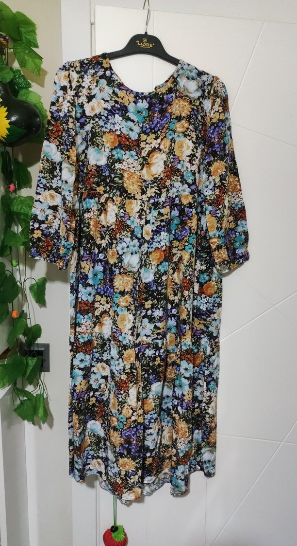 Uzun kollu, yuvarlak yakalı, bol kesim ve drapeli tasarıma sahip çok renkli çiçek desenli uzun elbise. Sentetik kumaştan, günlük kullanım için uygun.