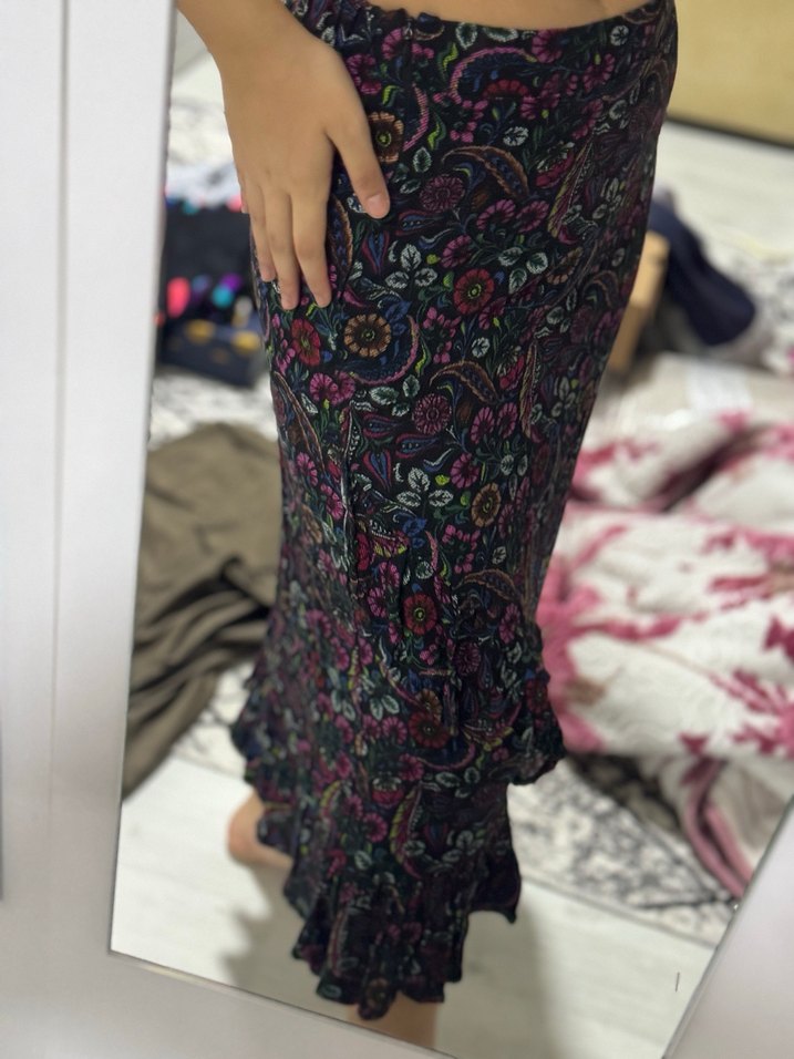 Sentetik kumaştan yapılmış, koyu renk çok renkli çiçek desenli, fırfırlı uzun ve dar kesim bohem etek.