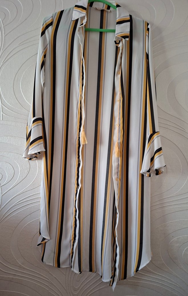 Uzun, bol kesim, uzun kollu kadın sabahlığı, gri ve beyaz çizgili desene sahip, bohem tarzda.