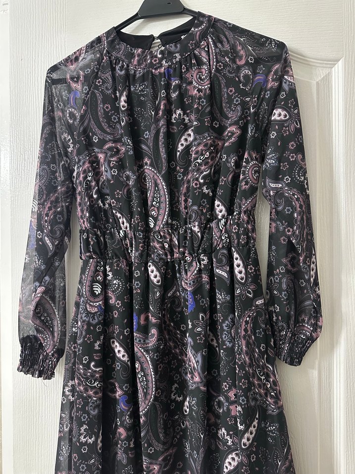 Uzun kollu, yüksek yakalı, bol kesim ve fırfır detaylı, koyu çok renkli paisley desenli bohem elbise.