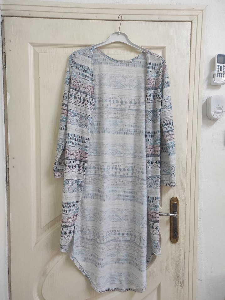 Uzun, salaş kesim bohem hırka. çok renkli batik desenli, drapeli ve yuvarlak yakalıdır. Uzun kollu ve yumuşak dokulu malzemeden günlük kullanıma uygundur. boy 117 cm.kol 62 cm likrali