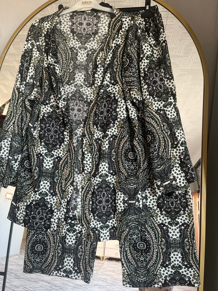 Uzun, bol kesim, drapeli uzun kollu ve V yakalı kadın kimono. Canlı koyu renkli çok desenli bohem tarzda. Sentetik kumaştan, günlük kullanım için rahat ve akışkan.