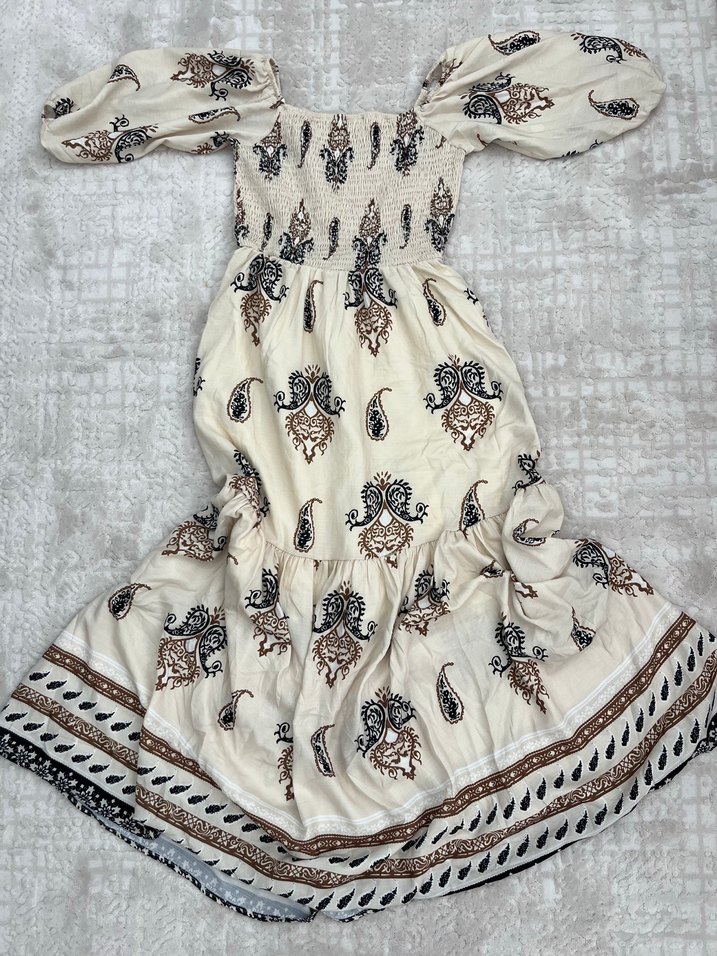 Bej uzun elbise, koyu desenlere ve straplez yaka ile kısa drapeli kollara sahiptir. Bol kesimli, bohem tarzda, günlük kullanım için uygundur. İçi kendşnden astarlıdır, iç göstermez. Yazın rahatlıkla giy çık bir elbise. Ürün hiç giyilmedi.