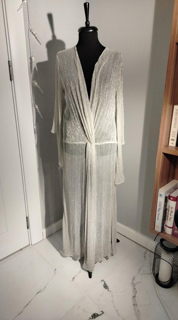 Uzun, bol kesim beyaz-gri tonlarda, uzun kollu, bohem tarzda kadın sabahlık. Düz ve desensiz dokusu ile avangart bir hava taşır.
