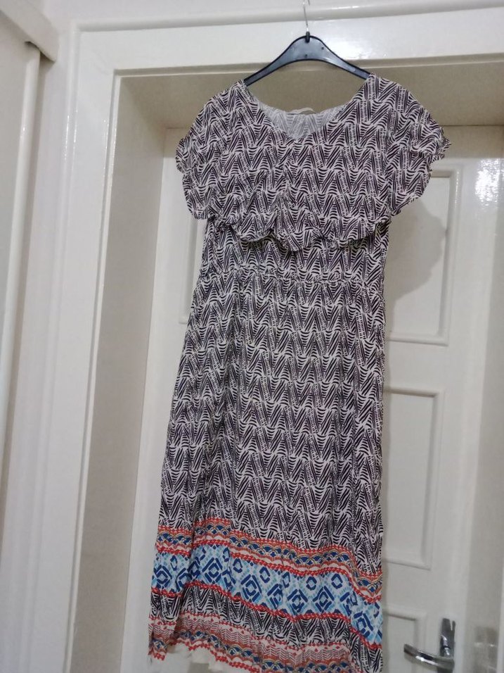 Volanlı, kolsuz ve straplez yaka uzun hamile elbisesi. Gri çok renkli batik desenli, bol kesim ve yumuşak dokulu kumaştan üretilmiştir.