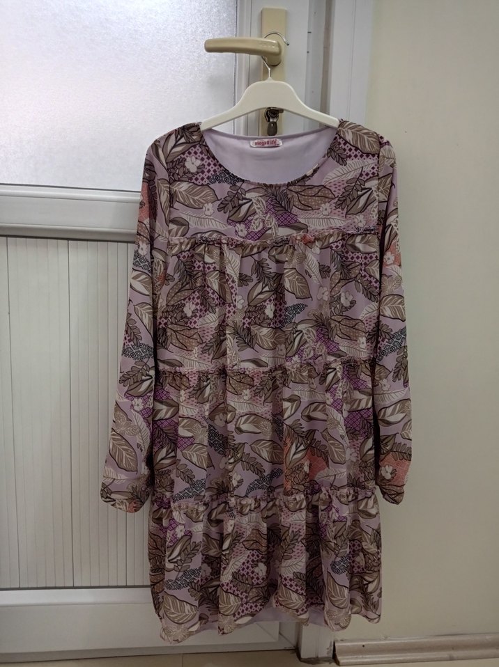 Bol kesim, uzun kollu hamile tunik, pile detaylı ve pastel mor desenli. Yumuşak sentetik kumaştan, yuvarlak yakalı, bohem tarzda günlük kullanım için.