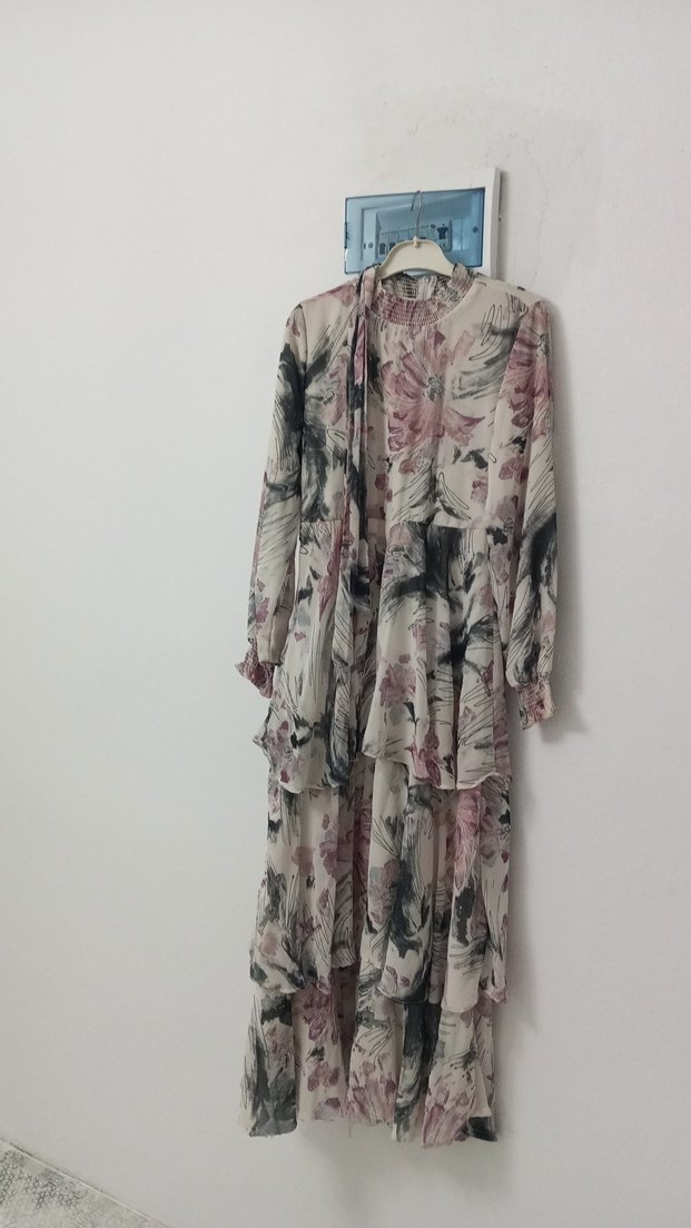 Yumuşak sentetik kumaştan yapılmış, uzun kollu ve yüksek yakalı, bol kesim kadın uzun elbise. Pembe bağlama desenli ve bohem tarzda drapeli detaylara sahip.
