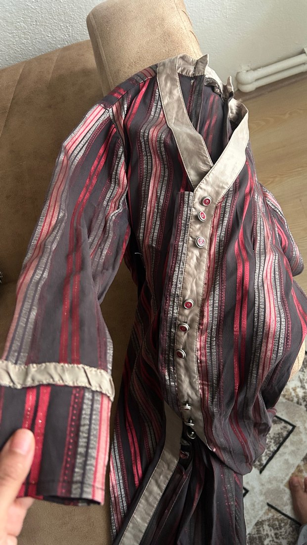 Uzun, bohem tarzda düğmeli ve bol kesim kadın gömlek. Bordo ve gri tonlarında çizgili batik desenli, uzun kollu, günlük kullanıma uygun.