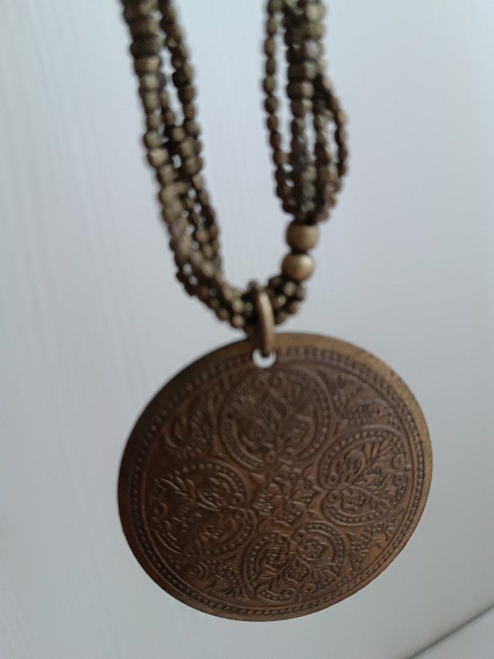 Uzun kahverengi tonlarda desenli yuvarlak kolye ucu olan bohem tarzda kadın kolyesi. Günlük kullanıma uygun.