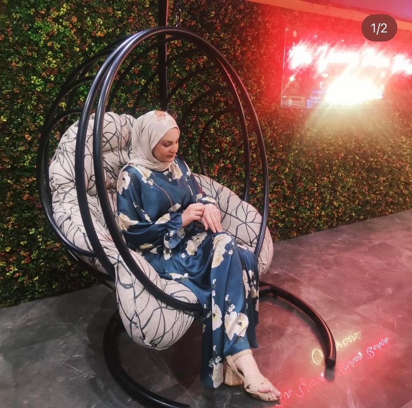 Uzun, bol kesim kadın saten tesettür elbise koyu mavi tie-dye desenli ve askılı kollu, bohem tarzını yansıtıyor.