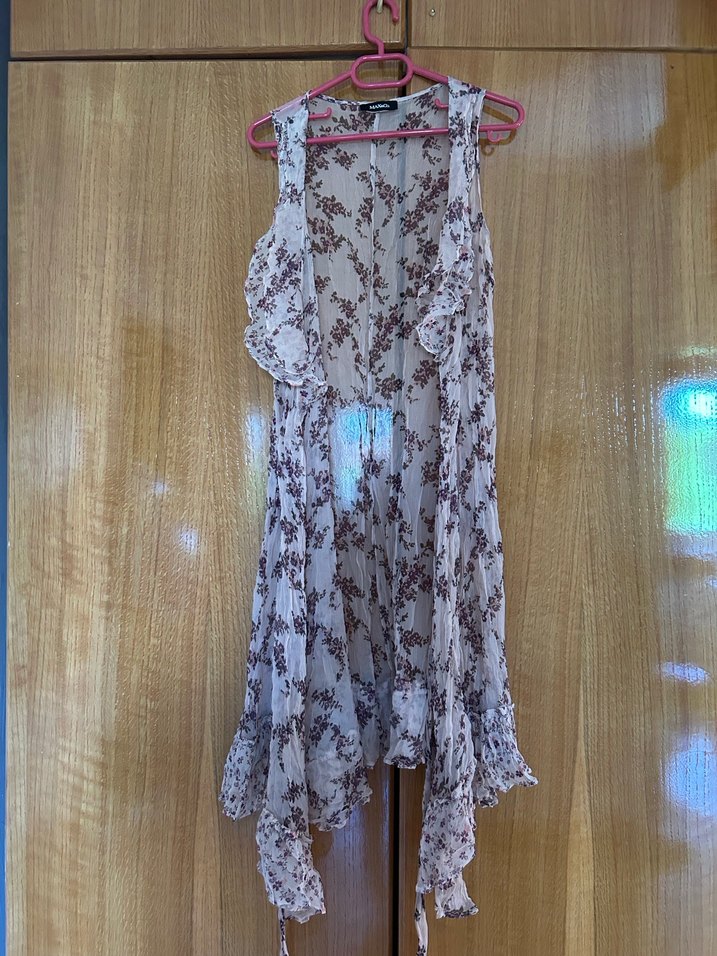 Uzun, kolsuz ve salaş kesimli, gri ve beyaz çiçek desenli batik desenli bohem tarzda.