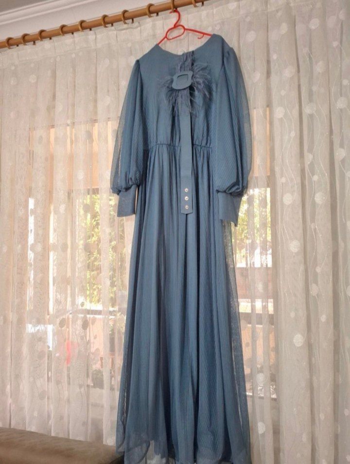 Uzun, bol kesim kadın abiye elbise, pileli detaylara ve yaka kısmında kesik yakaya sahiptir. Klasik bohem tarzında, uzun kollu ve yumuşak mavi renklidir, düğünler için uygundur.