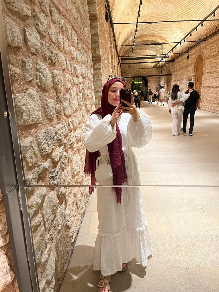 Yumuşak pamuktan, uzun kollu, yüksek yakalı ve etnik desenli, bol kesim beyaz elbise. Günlük ve şık kullanım için uygun, drapeli bohem tarzda.
