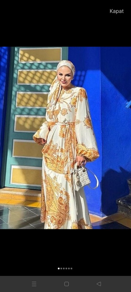 Uzun, salaş kesim, uzun kollu ve yüksek yakalı elbise. İpek gibi dokusu ve altın renkli batik desenleriyle, drapeli detaylara sahip, günlük ve düğünde kullanıma uygun mütevazı stil. 38-40beden arası olur. şalı ile satılık. 2 kere giydim. hiçbir deformesi yoktur.