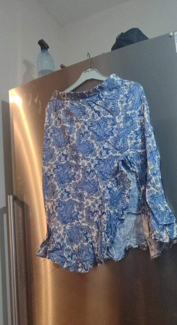 Mavi ve gri batik desenli, bol kesim ve drapeli uzun kadın eteği. Bohem, hippie tarzını yansıtır, günlük kullanım için uygundur.