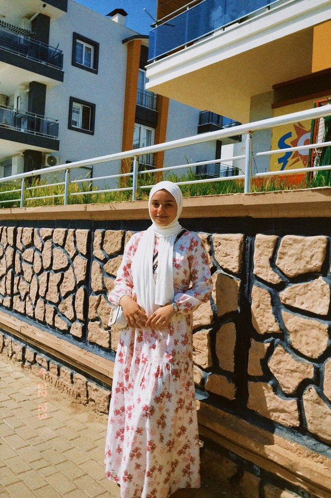Pamuklu, etnik çiçek desenli uzun beyaz elbise, bol kesim ve yüksek yakalıdır. Uzun kollu ve drapeli tasarımıyla günlük kullanıma uygundur. Beli kemerlidir. Üç göstermez.