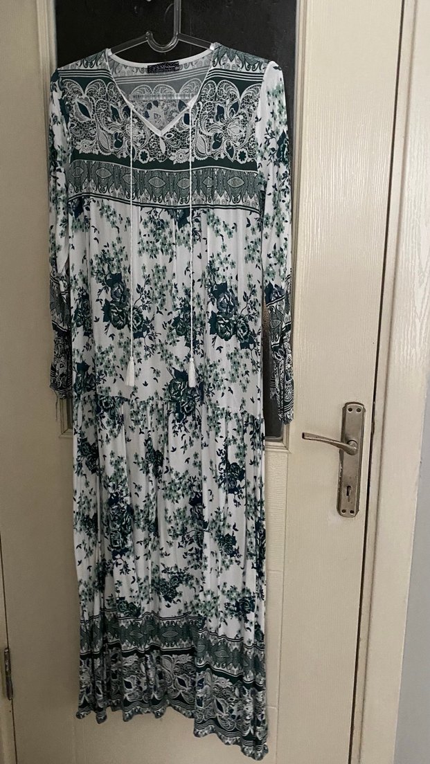 Uzun kollu, V yakalı ve bol kesimli bu uzun elbise, yeşil ve gri tonlarında batik desenlidir. Bohem tarzına uygun drapeli tasarıma sahiptir.