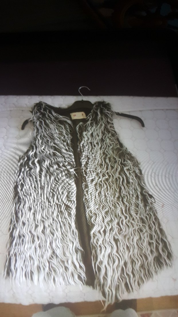Gri sentetik kumaştan, zebra desenli ve kürklü detaylı, uzun ve kolsuz, v yaka bohem tarzda fitted yelek.
