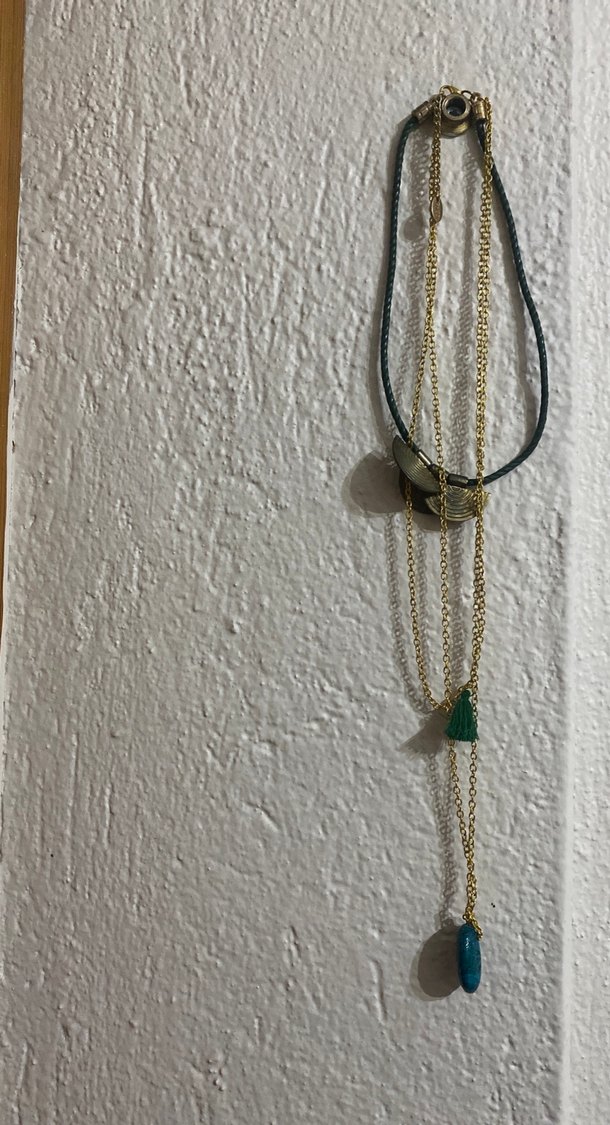 Uzun boylu, zincir detaylı, yılan desenli ve turkuaz renkli bohem kolye, günlük kullanıma uygundur.