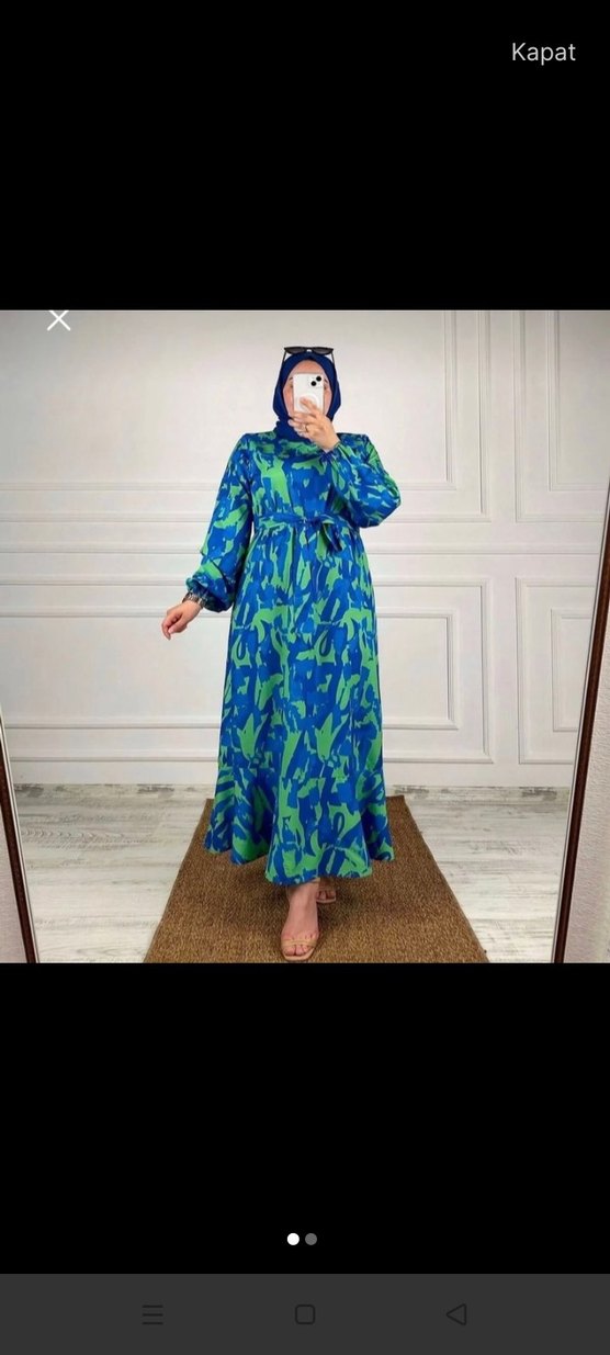 Uzun, bol kesim, mavi renkli bağcıklı elbise. Uzun kollu ve yüksek yakalı, bohem tarzda, yumuşak sentetik kumaştan yapılmıştır.