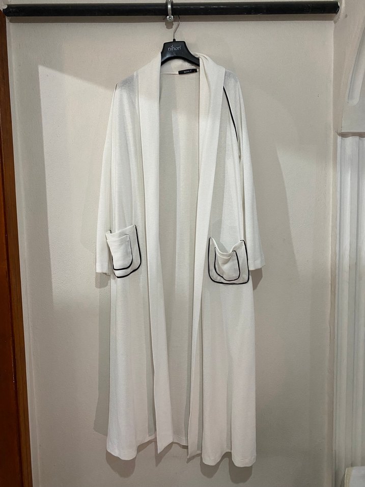 Uzun, bol kesim ve uzun kollu beyaz kadın hırka Minimalist tarzda, siyah detaylı iki cep bulunur. 2 beden.