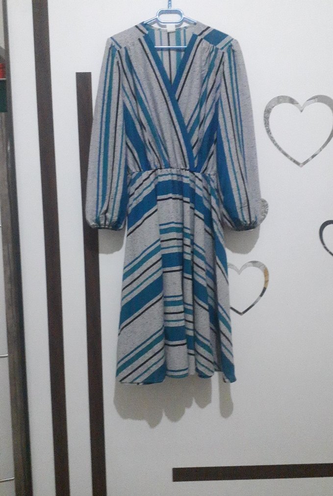 Uzun kollu, V yakalı, mavi-gri çizgili desenli, bol kesim ve belden büzgülü uzun kadın elbisesi. yırtığı söküğü yoktur 40 ila 42 beden uyumlu