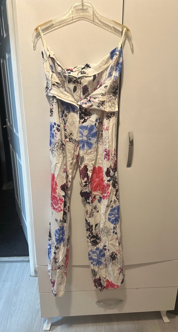 Uzun, bol kesim, çok renkli tie-dye desenli ve drapeli bohem tarzda kumaş pantolon, günlük kullanım için uygundur.