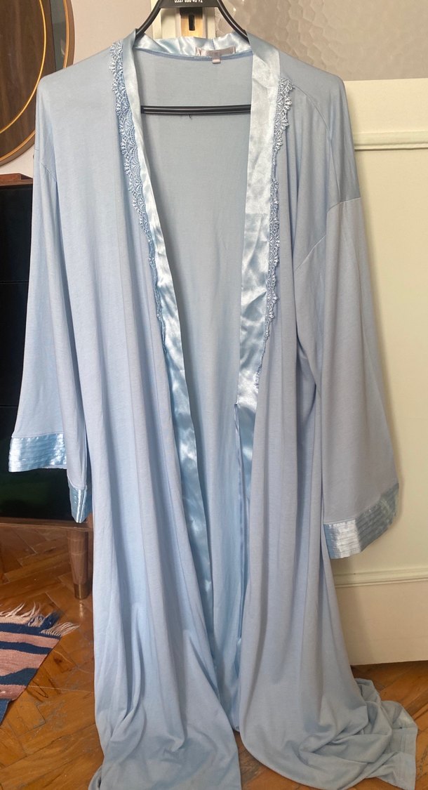 Kadınlar için uzun ve bol kesim açık mavi tonlarında, sade ve desen içermeyen, saten detaylı sabahlık. Uzun kollu ve rahat bir yapıya sahiptir. ️