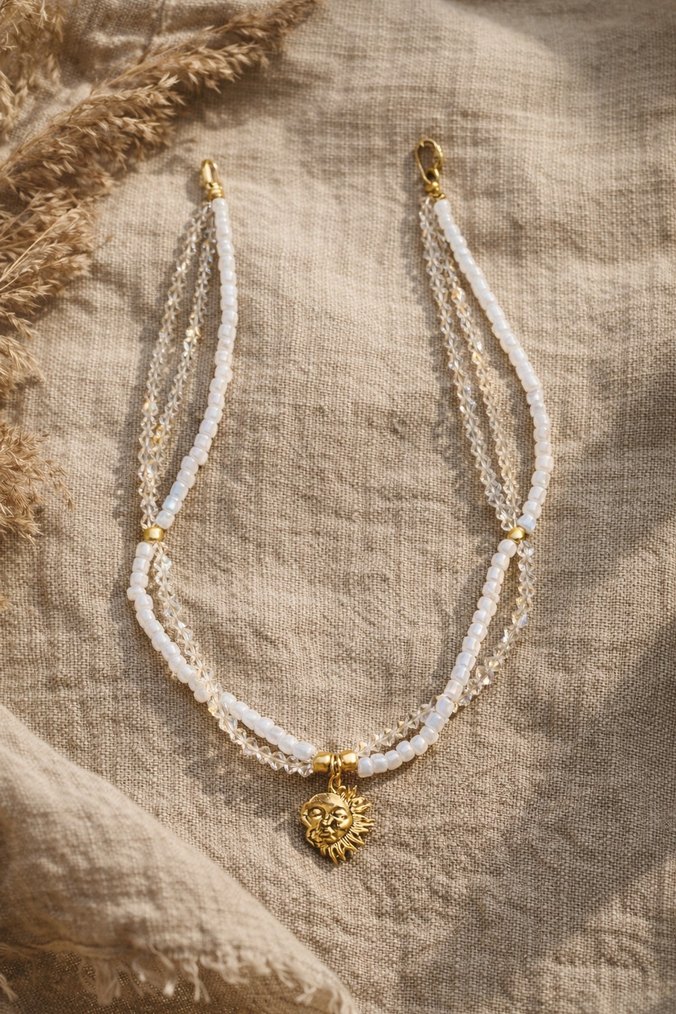 Uzun boncuklu ve işlemeli detaylara sahip altın renkli güneş kolye, bohem ve retro tarzını yansıtır, günlük kullanım için uygundur.