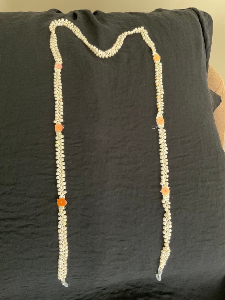 Uzun boyda, boncuklu ve bohem tarzda, açık altın renginde ve turuncu detaylı kadın gözlük zinciri
