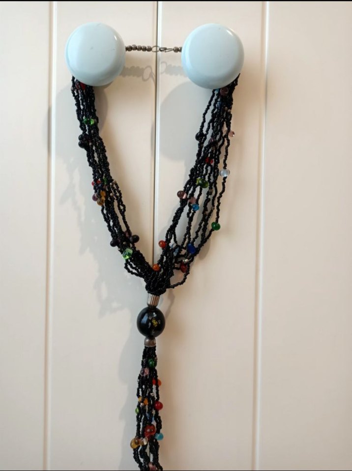Uzun, çok renkli boncuklardan oluşan bohem tarzı kolye, bağlama deseniyle günlük kullanıma uygundur.