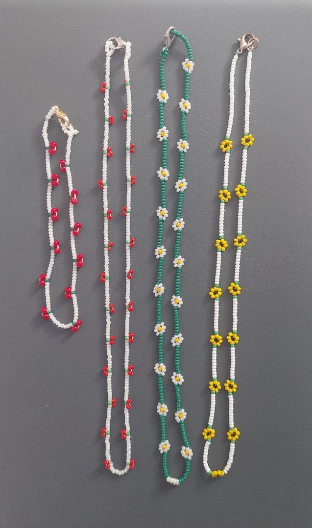 Uzun boncuklu, işlemeli renkli çiçek desenlerine sahip bohem tarzda kolyeler. Canlı ve retro görünüm sunar, günlük kullanıma uygundur.