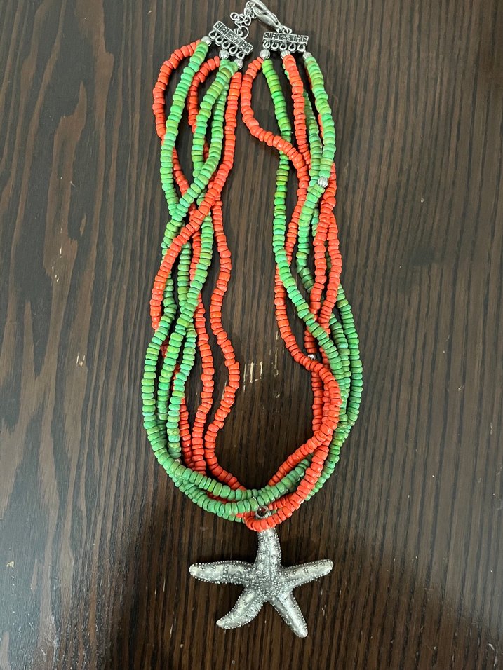 Uzun boncuklu, çok renkli yeşil ve turuncu boncuklardan oluşan, deniz yıldızı figürlü kolye, plaj ve bohem tarz için uygundur.