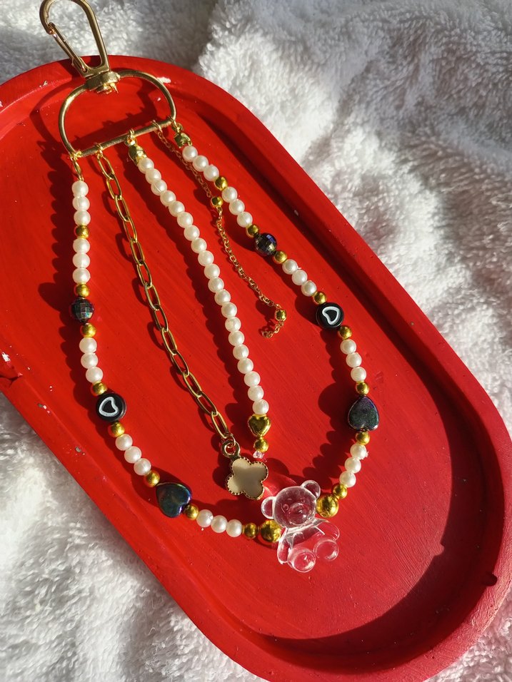 Uzun, altın tonlu boncuklu kolye, kalp ve oyuncak ayı detaylarıyla günlük kullanıma uygun bohem tarzda. sipariş üzerine yapılır.