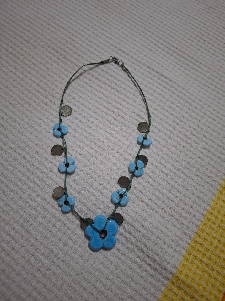 Uzun boyda, boncuklu ve nakışlı gri detaylara sahip turkuaz renkli bohem tarzda kadın kolye.1 papatya kırık
