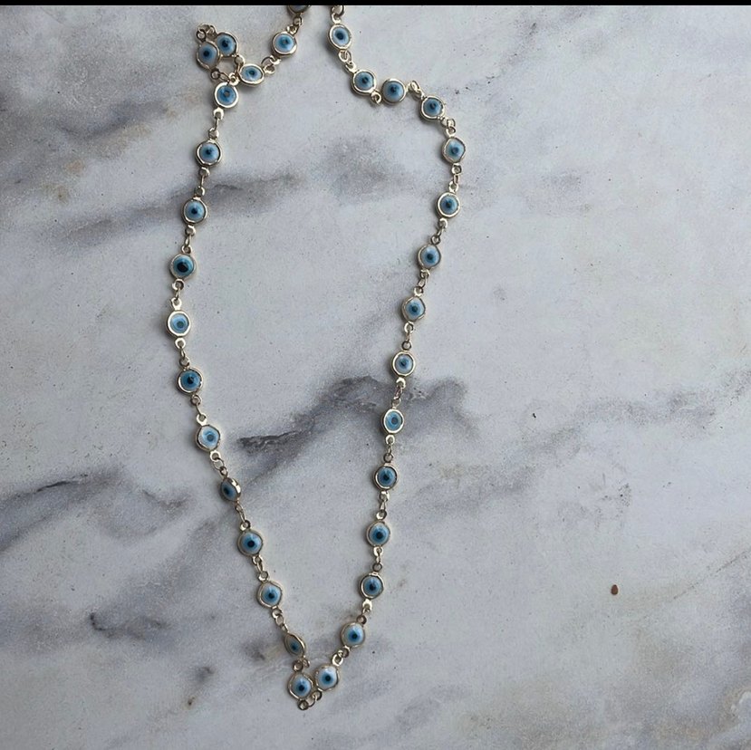 Uzun uzunlukta, turkuaz boncuklar ve gümüş tonlu metalden oluşan, günlük kullanıma uygun minimalist bohem tarzda bir kolye.