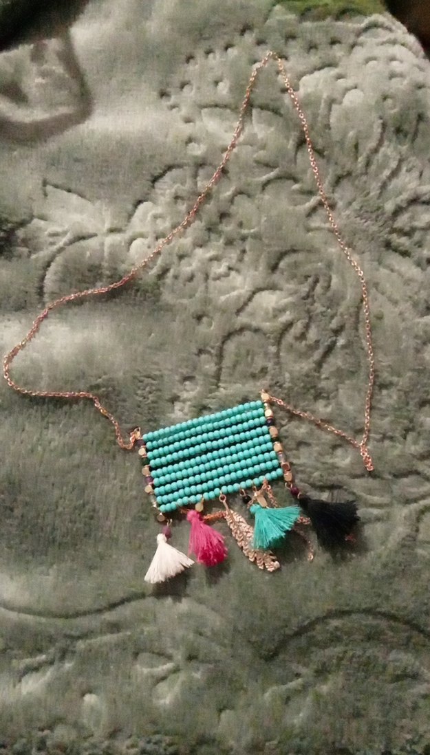 Uzun boncuklu ve renkli püsküllü turkuaz bohem kolye, günlük kullanım için uygundur.