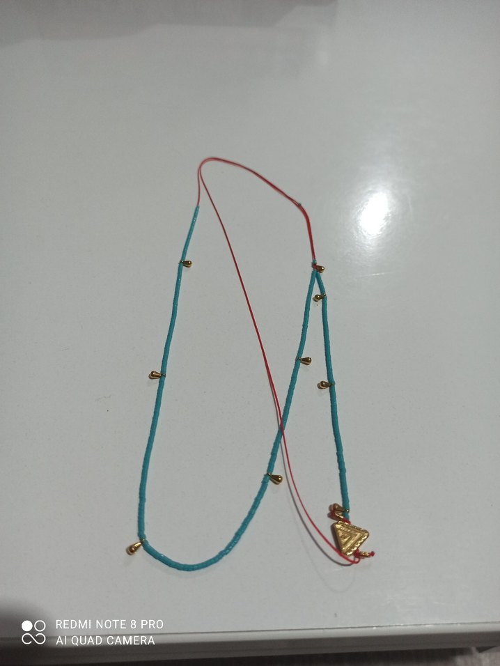 Uzun boncuklu turkuaz kolye, küçük altın detaylar ve nakışlı uç ile renkli bohem tarzını yansıtıyor.
