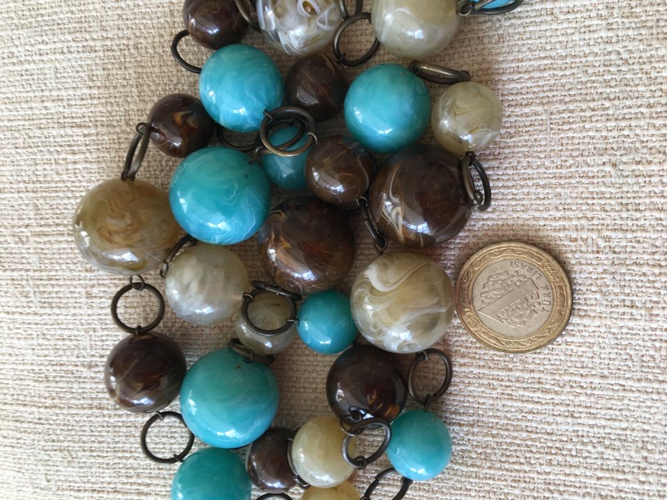 Turkuaz, kahverengi ve krem renkli boncuklardan oluşan uzun, desenli boncuklu kolye, bohem tarz için uygun. 90cm VİNTAGE 70ler