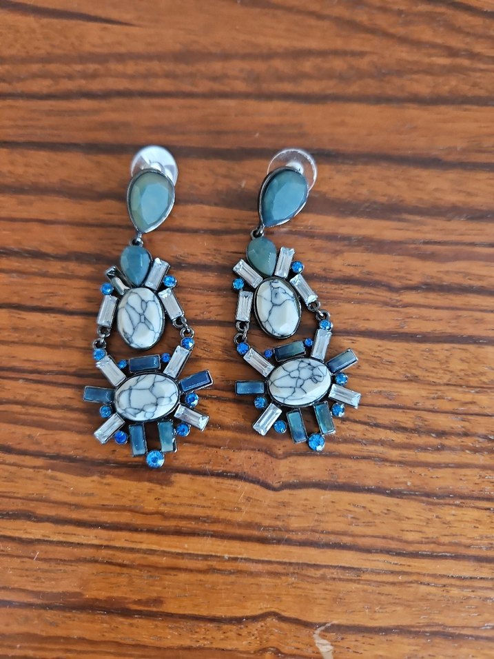 Uzun, boncuklu ve desenli taşlarıyla turkuaz ve gri renklerde bohem tarzda küpeler.
