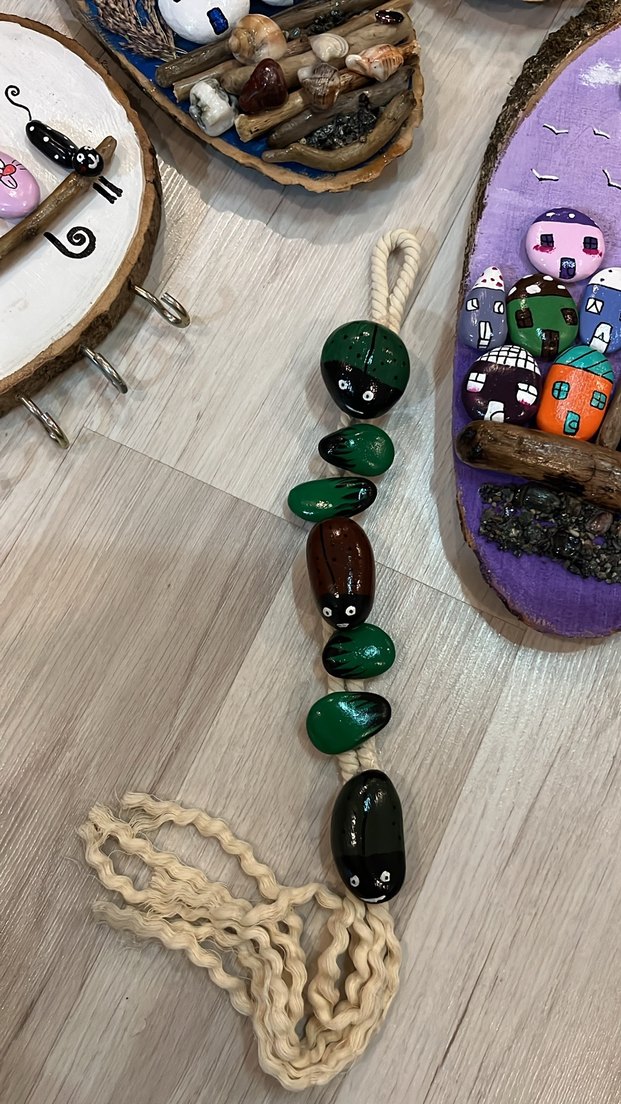 Uzun boylu, turkuaz renkli yılan desenli boncuklardan oluşan bohem tarzda kolye.