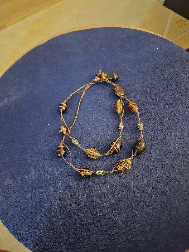 Uzun boylu, yılan desenli boncuklardan oluşan altın tonlu kolye, bohem tarz için uygundur. Günlük kullanıma uygun retro ve hippie havası taşır.