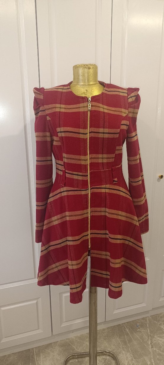 Uzun bordo renkli kaban, fermuarlı ön ve kesilmiş yaka detayına sahiptir. Çizgili vintage tarzda, regular fit ve uzun kolludur, günlük sokak modasına uygundur. ✨