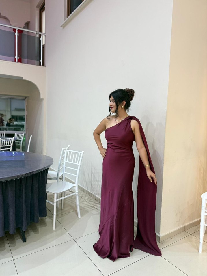 Uzun, bordo renkli, drapeli ve straplez kesime sahip kadın abiyesi. Kolsuz ve parlak dokusuyla düğünler için zarif bir seçenek. ✨