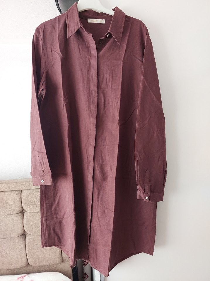 Bordo keten kumaştan, uzun kollu ve düğmeli önü olan bol kesim kadın tunik. Minimalist ve desensiz tasarımıyla günlük kullanıma uygundur.