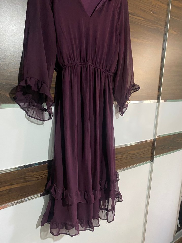 İlk iki foto benzediği icin koydum güncel fiyati 1100 lerde Uzun, bordo renkli, V yaka ve uzun kollu bohem elbise. Kuşaklı bel detayı ve bol kesimiyle romantik akşamlar için uygun, ipeksi dokuda.